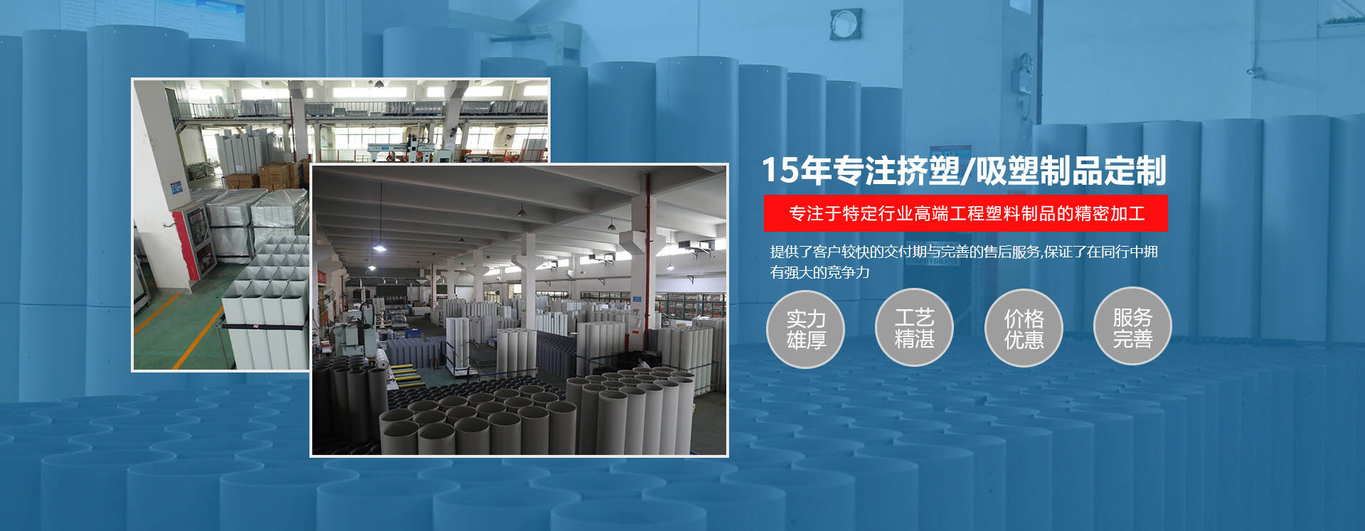 8000平米標(biāo)準(zhǔn)廠房,1500噸年產(chǎn) 能,引進(jìn)國內(nèi)高端品牌真空吸塑成型機(jī)和五軸精密加工中心。